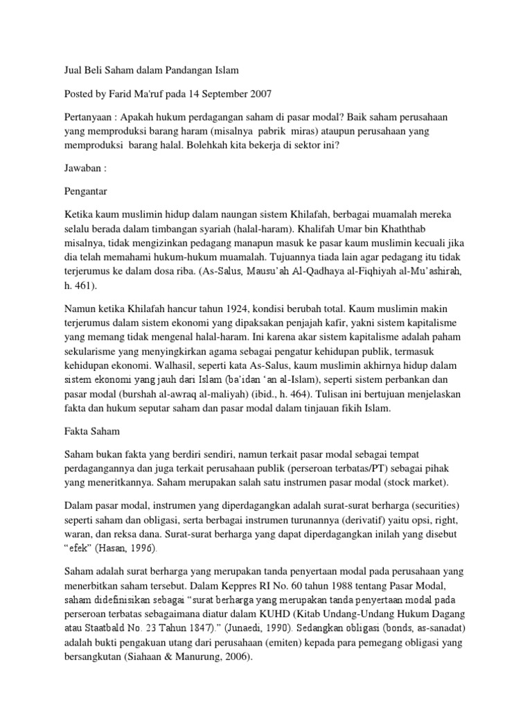 Hukum saham dalam islam. 12.09.2013 · Nota Pengajian Am Penggal 1 1. PENGAJIAN AM STPM & PENGAJIAN MALAYSIA Nota Ringkas Pengajian Am Penggal 1 (siri 1) KONSEP NEGARA Konsep Negara ada sempadan ada sistem pemerintahan ada rakyat/pemastautin tetap Sempadan negara yang beradaulat ada sempadan yang jelas sempadan membolehkan negara yang beradaulat ditadbir dengan sistematik sempadan … 1 Nov 2021 — Suara.com - Secara umum, hukum jual beli saham menurut Islam adalah halal apabila dilakukan sesuai dengan tuntutan syariah, utamanya jika ... Dalam islam, investasi merupakan tindakan bisnis yang halal dan dapat dibenarkan, selagi tata cara atau aturan sesuai yang diajarkan dalam Al- Qur'an dan hadist ... 02.11.2016 · Al Quran sebagai kitab teras dalam kepercayaan Islam telah memuatkan pelbagai khazanah ilmu yang meliputi empat paksi utama ilmu iaitu Akidah, Ibadat, Jinayat dan Munakahat. Penganut Islam yang benar-benar membaca dan menghayati isi kandungan Al Quran telah berjaya mengangkat syiar Islam ke seluruh empat penjuru alam. Pernah dikhabarkan, ketika ...