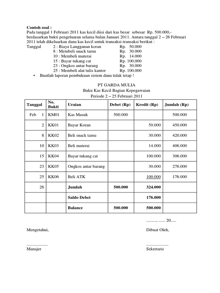 Dalam sistem dana tetap, pengelolaan kas kecil menyelenggarakan pembukuan, melainkan hanya mengadakan pencatatan kas kecil yang sifatnya intern untuk mengetahui saldo kas. Ciri-ciri penerapan metode dana tetap pada kas kecil adalah sebagai berikut : Pengelolaan kas kecil mengumpulkan bukti-bukti pengeluaran yang telah dilakukan sesuai ... Sistem dana tetap adalah sebuah sistem yang menyisihkan kas kecil dengan jumlah yang tetap dan tidak akan berubah untuk setiap periode pengisiannya. Perubahan ini hanya akan terjadi pada saat perusahaan memang menghendaki adanya perubahan jumlah dana tersebut yang tentunya melakukan beberapa pertimbangan sebelumnya. Sistem imprest adalah metode tetap dengan mengisi kembali dana kasnya, di mana besarnya saldo kas kecil perusahaan tidak berubah atau tetap. Contoh soal kas kecil beserta pembahasannya seven accounting 2 metode kas kecil metode imprest fluktuasi sistem pencatatan kas kecil metode . Sistem imprest adalah suatu cara mengelola kas kecil yang mana didalamnya mempunyai sistem dana tetap untuk kas perusahaan, sehingga dana tersebut bisa ditentukan dari jumlah dan kas kecil yang sudah ada sebelumnya. Sehingga, saat nantinya terjadi pengeluaran maka akan menyebabkan berkurangnya jumlah dana kas kecil dan karyawan atau pihak yang ...