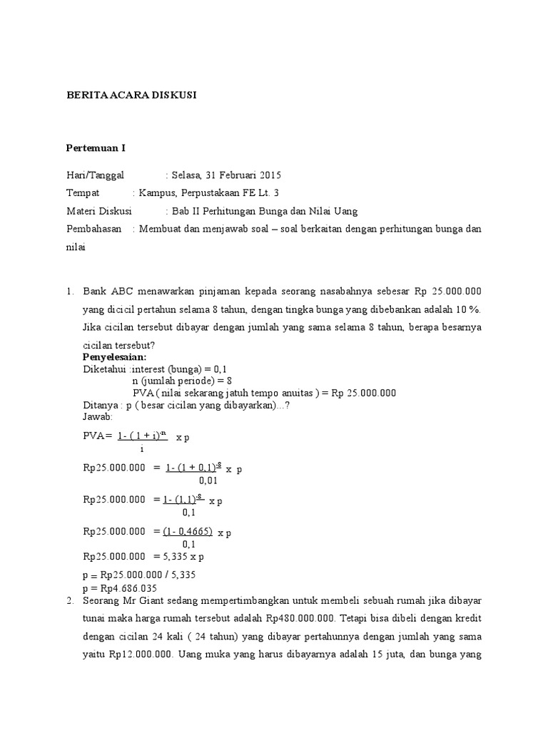 Tingkat bunga 15% per tahun dan bunga diperhitungkan setiap empat bulan sekali atau 3 kali dalam satu tahun, maka nilai sekarangnya: 1 NS Rp 10.000.000 X (5) (3) (1 0,15/3) -15 Rp 10.000.000 X (1,05) Rp 4.810.170, - Nilai sekarang anuitas 1 1 NSA A1 n r r(1 r) Atau NSA = A1 (NSFBAr,n) Nilai sekarang anuitas jika bunga dihitung lebih dari satu ... Jangan sampai kamu tidak mengetahui cara menghitung bunga pinjaman ketika hendak mengajukan pinjaman uang ke bank maupun pinjaman online yang sudah terdaftar di OJK. Lalu, kira-kira bagaimana sih cara menghitung bunga pinjaman? Apabila anda belum mengetahui cara menghitung bunga pinjaman per bulan, alanmgkah baiknya jika kalian mempelajari rumus yang telah kami siapkan di bawah ini. Nah itulah beberapa tips dan cara menghitung bunga pinjaman per bulan yang benar.