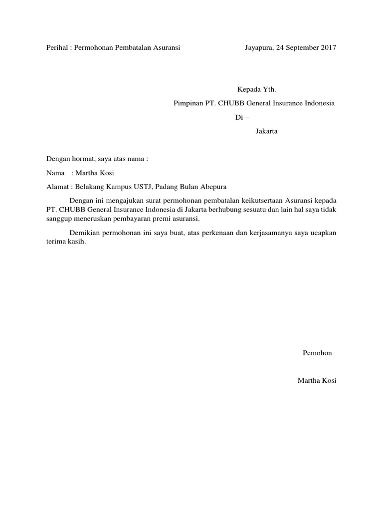 3. Polis yang sudah dilakukan Pembatalan/Penebusan tidak diperkenankan melakukan Pemulihan polis. 4. Dokumen yang harus dilampirkan : a. Polis asli b. Surat kehilangan dari kepolisian yang ditandatangani oleh Pemegang Polis (wajib jika Polis hilang), jika surat kehilangan dari kepolisian tidak ditandatangani oleh Surat pernyataan asuransi dapat digunakan untuk berbagai keperluan, seperti surat pernyataan asuransi mobil, pembatalan polis, pengganti sertifikat yang hilang, dan lain-lain. Surat pernyataan asuransi dapat bersifat resmi jika dibuat oleh lembaga/instansi tertentu sehingga memenuhi kaidah-kaidah atau format tertentu. Contoh surat pernyataan asuransi untuk pembatalan polis sebagai referensi pembuatan surat yang baik dan benar dapat diunduh secara gratis dan lengkap disini. 9152759173 mengajukan pembatalan program asuransi ini dikarenakan pendanaan yang tidak tetap pemegang polis masih kuliah. Contoh Surat Pembatalan Polis Asuransi Chubb / Macam Status Angkola Facebook: CIGNA (Pro Maxima & Pro - Untuk pembatalan polis asuransi jiwa, kesehatan atau kecelakaan diri,.. Ganti rugi tanggung klaim total. Untuk pembatalan polis asuransi jiwa, kesehatan atau kecelakaan diri,. Berlaku untuk polis yang dibeli pada dan setelah 29 juni 2019.