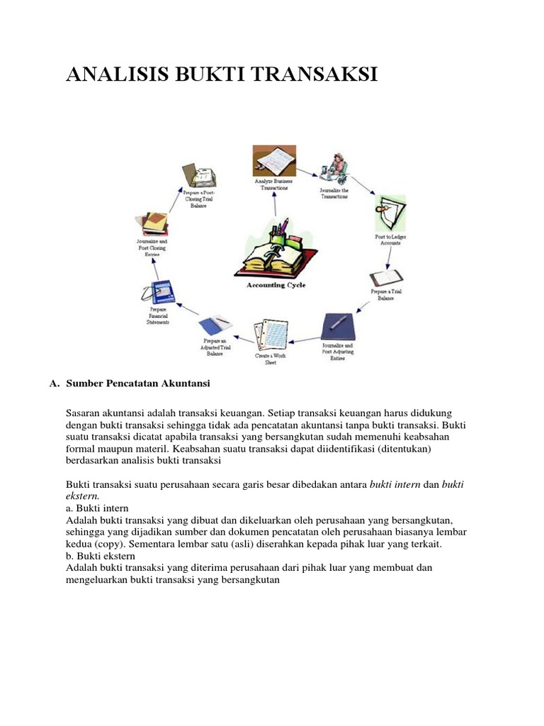 ANALISIS BUKTI TRANSAKSI. Sasaran akuntansi adalah transaksi keuangan. Setiap transaksi keuangan harus didukung dengan bukti transaksi sehingga tidak ada pencatatan akuntansi tanpa bukti transaksi. Bukti suatu transaksi dicatat apabila transaksi yang bersangkutan sudah memenuhi keabsahan formal maupun materil.