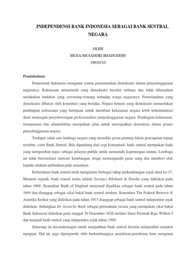 Bank indonesia sebagai bank sentral. Presiden Soekarno menerbitkan surat keputusan peresmian Bank ... Babak baru dalam sejarah Bank Indonesia sebagai Bank Sentral yang independen dalam melaksanakan tugas dan wewenangnya dimulai ketika sebuah undang-undang baru, yait u UU No. 23/1999 tentang Bank Indonesia, dinyatakan berlaku pada tanggal 17 Mei 1999 dan sebagaimana telah diubah dengan Undang-Undang Republik Indonesia No. 6/ 2009. Academia.edu is a platform for academics to share research papers. Bank Indonesia Bank Indonesia adalah bank sentral independen dalam melaksanakan tugas dan wewenangnya sejak saat undang-undang baru, yaitu Undang [1]Undang No 23/1999 tentang Bank Indonesia, mulai berlaku pada tanggal 17 Mei 1999 dan diamandemen oleh hukum Republik Indonesia. 6/2009.