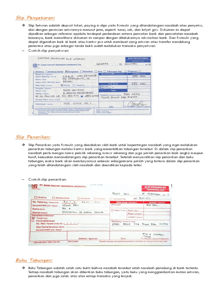 Contoh slip setoran bank bri. Sep 20, 2020 — Cara Pembayaran Via Teller Bank BRI a. Mengambil Slip ... Mengisi slip setoran dengan tata cara sebagai berikut : ... 42021110004 (Contoh).3 pages Kode C atau Credit artinya ialah adanya transaksi uang yang masuk ke dalam rekening, baik dari sesama bank BRI atau bank lain. Dapat juga berupa setoran tunai. 15. Kode D. Kode D atau Debet artinya ialah adanya transaksi uang yang keluar dari rekening, baik ke sesama bank BRI atau ke bank lain. (Jumlah digit kode pendaftaran, contoh: 123085678900000000), dalam kolom keterangan / berita di slip setoran. ▫ Selanjutnya menyerahkan kepada petugas Bank ...2 pages Teller merupakan petugas Bank yang pekerjaan sehari-harinya yang berhubungan langsung dengan nasabah dan masyarakat umum. Bank harus menyeleksi petugas yang akan ditunjuk sebagai Teller karena cara kerja, sikap dan sifat serta cara pelayanannya kepada nasabah dan masyarakat umum, secara tidak langsung akan mencerminkan keadaan dan reputasi Bank.