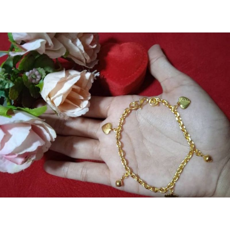 Perhiasan yang satu ini memiliki berat 1.5 gram, dengan emas 18 karat. 4. Sweet Darling Bangle. Mungkin Anda lebih menyukai perhiasan gelang emas yang tidak monoton. Seperti gelang emas yang memiliki perpaduan warna atau juga dihiasi dengan kristal. Memang, variasi pada perhiasan emas akan membuatnya padu dengan pakaian yang Anda gunakan.