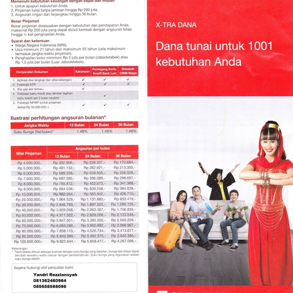 21/08/2016 · kta cimb niaga (x-tra dana) X-Tra Dana CIMB Niaga adalah Pinjaman tunai tanpa jaminan, untuk apapun kebutuhan Anda seperti renovasi rumah, pendidikan pernikahan, liburan dan lainnya. Jangka waktu Pinjaman hingga 4 tahun dan jumlah Pinjaman Rp 5 juta sd Rp 200 juta dengan cicilan bulanan tetap.