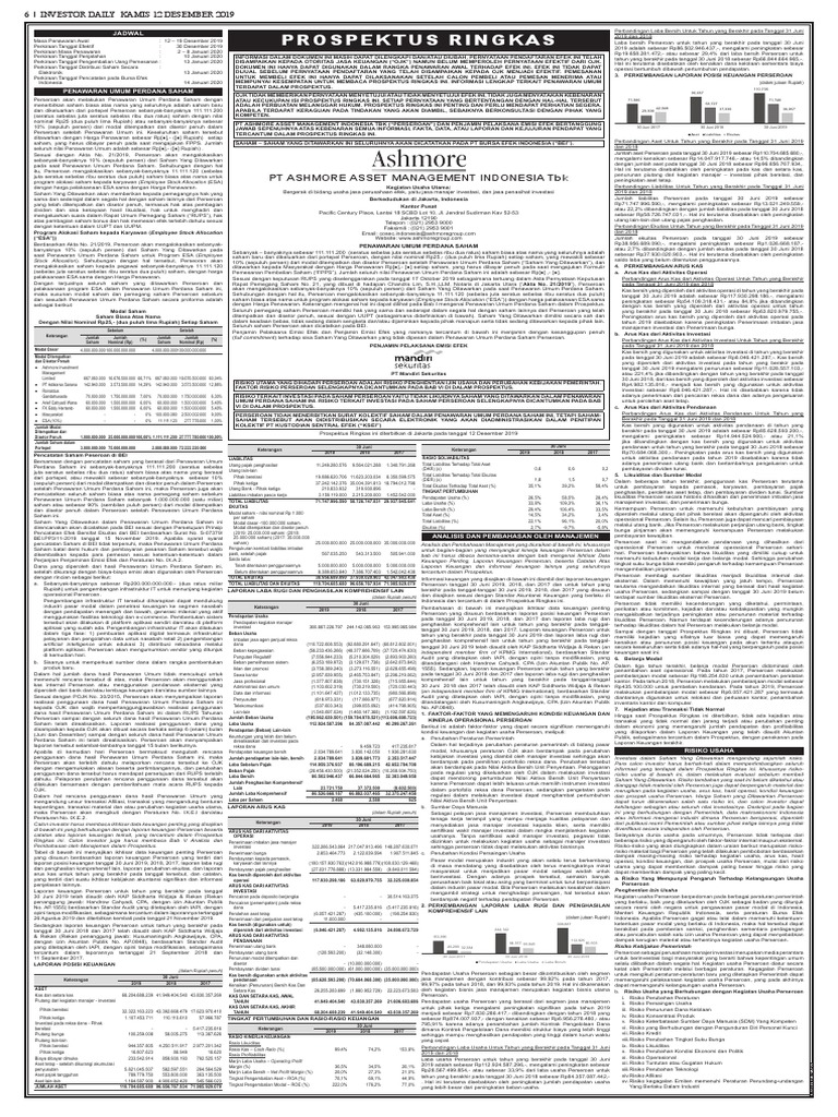 It comprised Ashmore Dana Obligasi Unggulan Nusantara Mutual Funds of IDR 6.62 trillion and Ashmore Dana Ekuitas Nusantara of IDR 6.48 trillion. By the end of June 2021, AMOR's AUM reportedly amounted to IDR 34.94 trillion. (LK/ZH) dana obligasi ekuitas pendapatan. Share: Latest News. Data terbaru Reksadana di Indonesia. Dapatkan harga terkini, tertinggi, terendah, dan waktu tutup pasar.