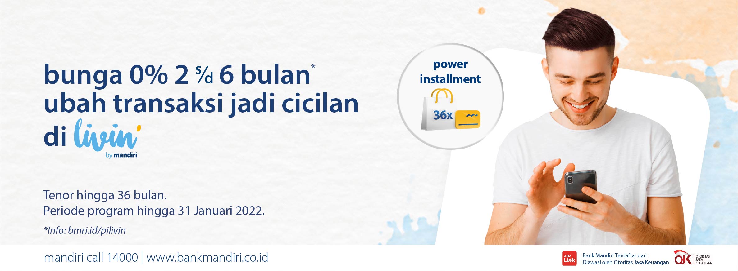 Power Cash. Livin' menyediakan fitur Power Cash bagi nasabah terpilih untuk mencairkan dana tunai dari kartu kredit yang dimiliki nasabah. Nasabah kartu kredit pengguna Mandiri Online dapat mengajukan pinjaman Power Cash mulai dari Rp 1 Juta hingga Rp 100 Juta (maksimal 50% dari sisa limit kartu kredit). Cara Pengajuan Power Cash. Cicilan Bank Mandiri untuk 3, 6, dan 12 bulan berlaku untuk pembelian tiket pesawat, Hotel, Tiket Kereta Api dan Paket Tour Minimum transaksi untuk cicilan Bank Mandiri adalah Rp. 500,000 Menggunakan kartu kredit Mandiri berlogo VISA/Master. C. Cicilan 0%. Layanan Pembayaran Dengan Sistem Cicilan 0%, untuk pemegang kartu kredit berlogo Visa & Mastercard, berlaku ketentuan tenor angsuran sebagaimana diatur dalam tabel dibawah ini: * Khusus untuk BRI, minimum pembelanjaan untuk tenor angsuran selama 12 (dua belas) bulan adalah sebesar Rp 3.000.000 (tiga juta Rupiah). Periode Program: Hingga 15 Januari 2016 Program Konversi Cicilan adalah program cicilan yang khusus diperuntukan bagi pemegang Kartu Kredit OCBC NISP Platinum dan Titanium yang melakukan transaksi pembelanjaan minimal Rp 500.000,- per transaksi/swipe dengan mengkonversi transaksi tersebut menjadi cicilan dengan bunga 0,5% untuk jangka waktu 3 bulan, 6 bulan, 12 bulan atau 24 bulan.