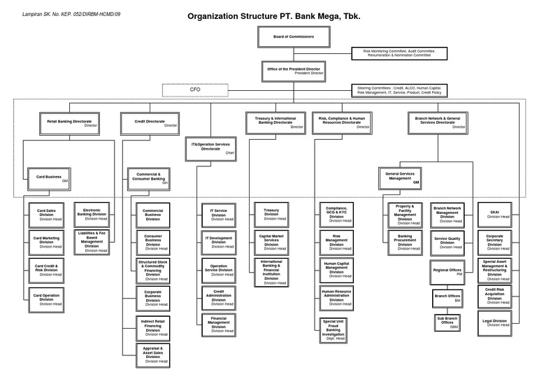 Organization Structure PT. Bank Mega, Tbk. Board of Commisioners Risk Monitoring Committee, Audit Committee, Renumeration & Nomination Committee Office of the President Director President Director CFO Steering Committees : Credit, ALCO, Human Capital, Risk Management, IT, Service, Product, Credit Policy Retail Banking Directorate Director