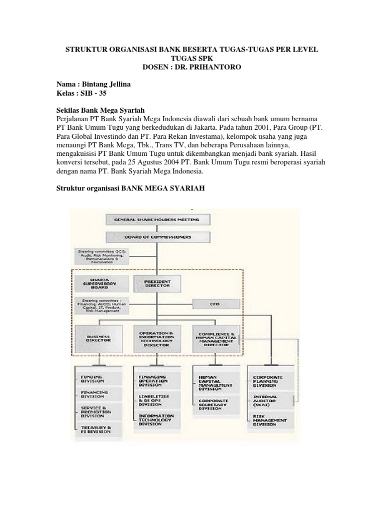 Struktur organisasi bank mega. Struktur organisasi PT. Bank Tabungan Negara (Persero) Tbk. Terlampir . 16 2.7 Unit Terkait Berikut adalah unit-unit yang terkait dalam proses pemberian Kredit Yasa Griya/Kredit Konstruksi pada PT. Bank Tabungan Negara (Persero) Tbk. Kantor Cabang Semarang. 2.7.1 Branch Manager ... Bank Mega (PT. Bank Karman) adalah perusahaan Indonesia yang didirikan pada tahun 1969, bergerak di bidang jasa keuangan perbankan dan berbentuk perseroan terbatas . Bank ini berbasis di Jakarta dan merupakan bagian dari CT Corp. Berawal dari sebuah usaha milik keluarga, PT. Mega Bank awalnya berkedudukan di Surabaya. Bank swasta: Bank yang didirikan oleh pihak swasta baik individu maupun korporasi. Contoh bank swasta di Indonesia yaitu BCA, Bank Permata, Bank Danamon, Bank Mega dan lain-lain. Bank milik koperasi: Bank yang didirikan oleh lembaga berbadan hukum koperasi dan seluruh modalnya dimiliki oleh koperasi. Bank Mega memiliki Visi Menjadi Kebanggaan Bangsa,sedangkan misi Bank Mega adalah Mewujudkan hubungan baik yang berkesinambungan dengan nasabah melalui layanan perbankan inovatif dan sinergi dengan didukung oleh ekosistem yang terintegrasi, sumber daya manusia yang profesional serta kemampuan kinerja organisasi terbaik untuk memberikan nilai ...