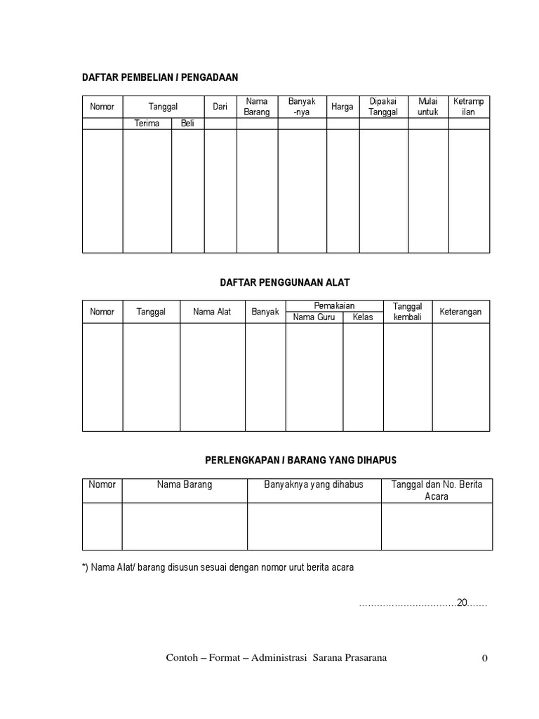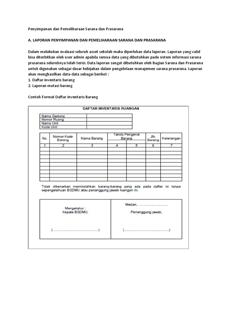 Download contoh format administrasi sarana dan prasarana pendidikan di sekolah/madrasah selengkapnya mengenai susunan dan isi berkas contoh format administrasi sarana dan prasarana pendidikan di sekolah/madrasah ini silahkan lihat dan unduh pada link di bawah ini: contoh format buku inventaris barang sekolah bisa dijadikan buku induk dari ... Contoh dokumen investasi sarana dan prasarana sekolah. 1 format buku inventaris sarana prasarana 1. Anda dapat melihat preview sebelum mendownload guna menghindari kesalahan. Adapun contoh format dokumen investasi sarana dan prasarana sekolah yang ada pada proposal penambahan ruang kelas baru yang terdiri sari 4 bab seperti berikut ini. Format Dokumen Investasi Sarana Dan Prasarana Sekolah. Contoh Laporan Sarana Dan Prasarana Sekolah Dasar Kumpulan Contoh Laporan Https Www Quantumbook Id Wp Content Uploads 2019 08 109 Otomatisasi Tata Kelola Sarana Dan Prasarana C3 Kelas Xii 1 20 Pdf. Admin blog Temukan Contoh 2019 juga mengumpulkan gambar-gambar lainnya terkait contoh dokumen ...