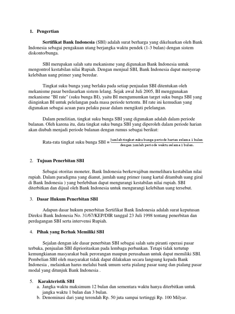 Sertifikat Deposito Bank Indonesia (SDBI) adalah surat berharga dalam mata uang rupiah yang diterbitkan oleh BI sebagai pengakuan utang berjangka waktu pendek yang dapat diperdagangkan hanya antar Bank. Sertifikat Bank Indonesia Syariah (SBIS) adalah surat berharga berdasarkan prinsip 2.3.3 Pengertian Sertifikat Bank Indonesia (SBI) Tingkat suku bunga diukur dengan menggunakan suku bunga yang ditentukan oleh bank Indonesia selaku penguasa moneter melalui SBI. Besar kecilnya suku bunga sangat tergantung dari kondisi makro yang berkembang di Indonesia. Pengertian Sertifikat Bank Indonesia Sertifikat Bank Indonesia (SBI) adalah surat berharga dalam mata uang rupiah yang dikeluarkan Bank Indonesia sebagai bentuk pengakuan utang jangka pendek dengan sistem bunga atau diskonto. SBI punya jangka waktu atau jatuh tempo untuk pencairannya. Pengertian Sertifikat Bank Indonesia Sertifikat Bank Indonesia (SBI) adalah surat berharga yang dikeluarkan oleh Bank Indonesia sebagai pengakuan utang berjangka waktu pendek (1-3 bulan) dengan sistem diskonto/bunga. ads SBI adalah aib satu mekanisme yang digunakan Bank Indonesia untuk mengontrol kestabilan nilai Rupiah.