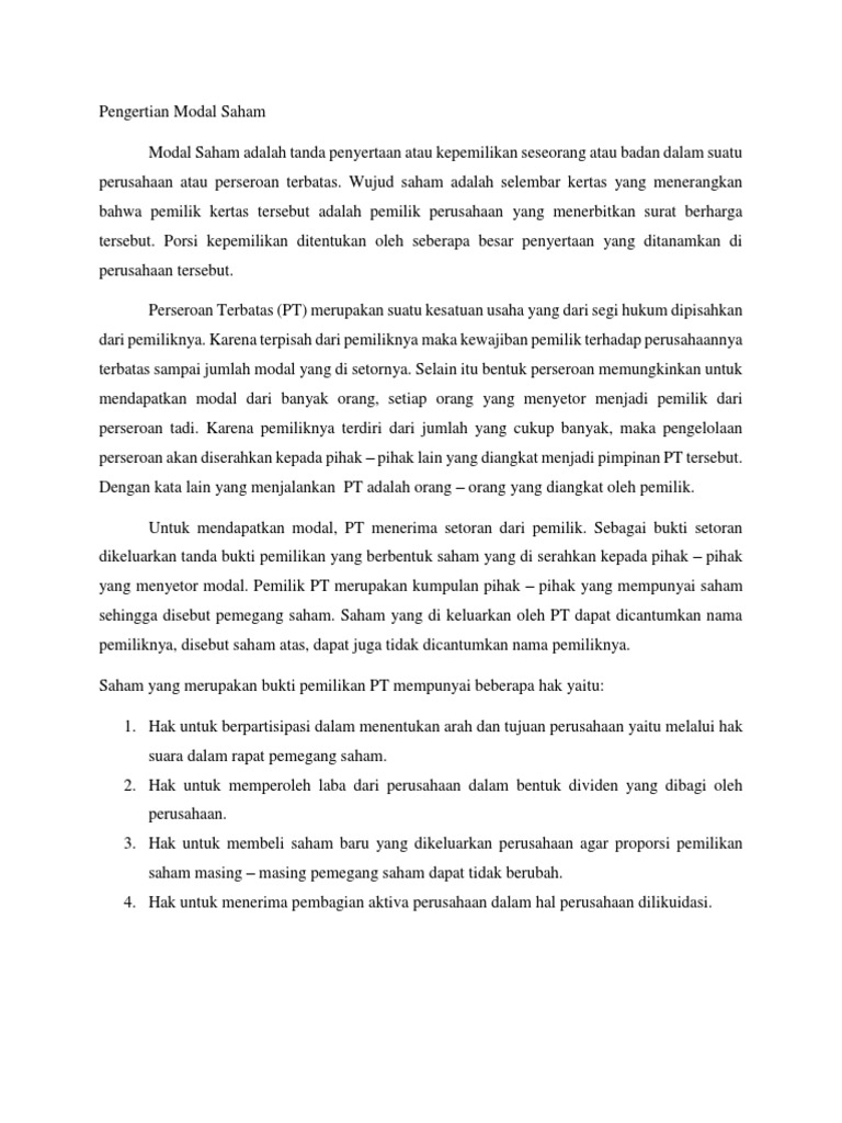 Suatu bentuk badan usaha yang modalnya terdiri atas saham-saham disebut. Sep 11, 2015 · Bentuk Bentuk Badan Usaha #4 : Perseroan Terbatas (PT) PT adalah sebuah badan usaha sekaligus badan hukum yang terdiri dari para pemegang saham yang biasa disebut pesero atau stockholder dan mempunyai tanggung jawab terbatas terhadap utang-utang perusahaan sebesar modal yang mereka setorkan. Secara umum, pengertian PT adalah suatu bentuk badan usahaberbadan hukum di mana modalnya terdiri dari saham-saham, yang setiap pemiliknya mempunyai bagian sebanyak saham yang dimilikinya. Saham-saham yang menjadi modal pendirian Perseroan Terbatas dapat diperjual-belikan sehingga perubahan kepemilikan perusahaan dapat dilakukan tanpa perlu melakukan pembubaran perusahaan. Pendapat lain mengatakan, pengertian PT atau Perseroan Terbatas adalah suatu badan usaha yang melakukan persekutuan modal (saham) dengan kemampuan mengatur sahamdi mana para pemilik modal mempunyai tanggungjawab sesuai dengan besar saham miliknya. Pada umumnya perusahaan berbentuk Perseroan Terbatas didirikan oleh minimal dua orang atau lebih melalui suatu kesepakatan yang diketahui oleh notaris dan dibuatkan aktanya. Selanjutnya akta tersebut harus mendapatkan pengesahan dari Kementerian Hukum dan HAM agar perusahaan tersebut resmi menjadi sebuah Perseroan Terbatas (PT). Perusahaan ini modalnya terdiri atas saham-saham. Sebagian sahamnya dimiliki oleh negara dan sebagian lagi dimilik oleh pihak swasta dan luar negeri. 2. Badan Usaha Milik Swasta Bentuk badan usaha ini adalah badan usaha yang pemiliknya sepenuhnya berada ditangan individu atau swasta. Badan Usaha Milik Swasta (BUMS) adalah badan usaha yang seluruh atau sebagian besar modalnya merupakan milik swasta. Secara umum, BUMS terdiri dari perusahaan perseorangan, Firma, Persekutuan Komanditer (CV) dan Perseroan Terbatas (PT).