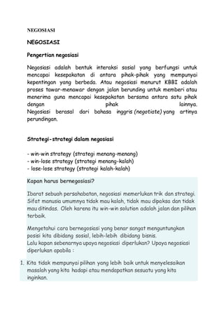 Contoh MODUL Negosiasi Bisnis - Matkul PTI Negosiasi bisnis adalah untuk memastikan akhir negosiasi Tuntutan dalam persaingan global sangat berarti dalam negosiasi bisnis, tentunya dengan concept yang kita gunakan win-win solution akan mengambilkan suatu hasil yang berarti dengan mitra bisnis kita. Karakreistik negosiasi yang baik yaitu: 21 1.