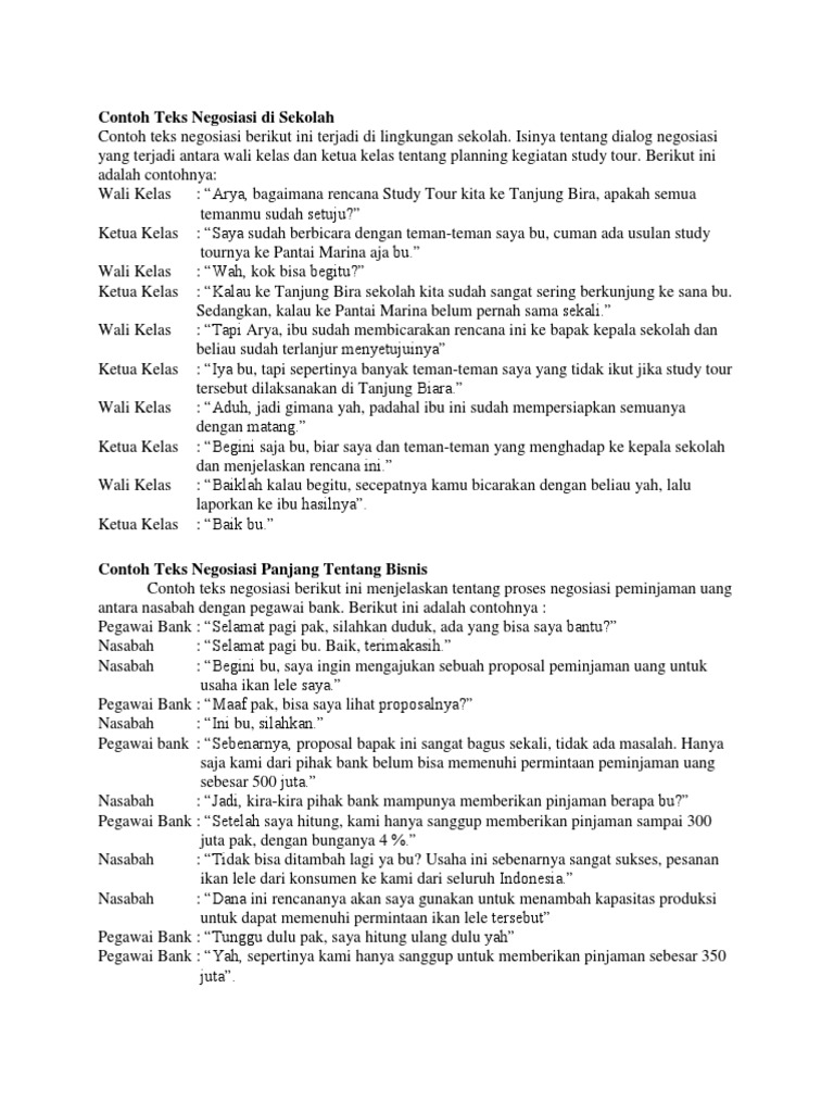 Contoh Teks Negosiasi Dalam Bisnis Untuk Mencapai ... Berikut ini beberapa contoh teks negosiasi dalam bisnis yang bisa digunakan untuk memastikan kerja sama yang baik di dalam sebuah usaha. Terutama saat melakukan negosiasi dengan pihak pelanggan pada saat melakukan transaksi. Pembukaan. A: "Bu, mampir ke toko saya, ini ada koleksi baju terbaru.". B: "Oh baik Mbak, saya lihat-lihat dulu.".