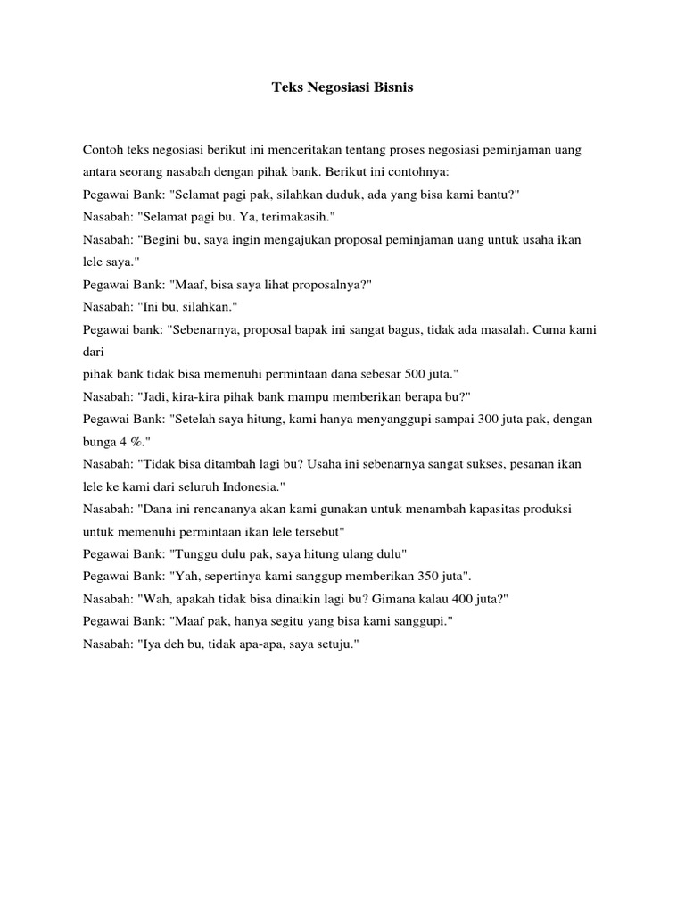 Contoh Percakapan Negosiasi Dalam Bidang Bisnis Contoh Teks Negosiasi Jual-Beli. Contoh percakapan negosiasi dalam bidang bisnis. Contoh berikut ini memperlihatkan proses negosiasi yang terjadi antara penjual dan pembeli tentang harga dari suatu gitar. Begini bu saya ingin mengajukan proposal peminjaman uang untuk usaha ikan lele saya Pegawai Bank.