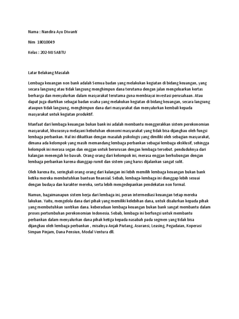 Makalah lembaga keuangan non bank. Lembaga Keuangan Bank - Pengertian, Fungsi, Ciri, Struktur Dan Contohnya : LKB adalah perusahaan yang merupakan kombinasi dan berbagai Lembaga Keuangan Bank : Pengertian, Jenis Dan Perannya - DosenPendidikan.Com - Untuk pembahasan kali ini kami akan memberikan... Download Free PDF. Makalah Keuangan & Lembaga Keuangan Non Bank "Pegadaian". I. Sumber Pendanaan Pegadaian sebagai lembaga keuangan tidak diperkenankan menghimpun dana secara langsung dari masyarakat dalam bentuk simpanan, misalnya giro, deposito, dan tabungan. Adalah Lembaga keuangan non bank yang menghimpun dana dari para anggotanya dan selanjutnya menyalurkannya kembali kepada anggotanya dan non anggotanya. Bunga pinjaman yang diberikan biasanya lebih besar daripada bank dan pegadaian.Tetapi bagi anggotanya akan menerima bagi... Lembaga keuangan non Bank adalah semua badan yang melakukan kegiatan dibidang keuangan, yang secara langsung atau tidak langsung menghimpun dana ataupun dengan jalan mengeluarkan kertas berharga dan menyalurkan dalam masyarakat terutama guna membiayai investasi perusahaan.