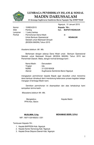 Proposal Permohonan Bosda Madin 2017.doc [ylyxywmz6dnm] Bermaksud untuk mengajukan permohonan bantuan dana berupa uang sebesar Rp7.200.000 ( Tujuh Juta Dua Ratus Ribu Rupiah ) Dana tersebut akan kami gunakan untuk Penyelenggaraan Pendidikan Diniyah dan Guru Swasta. Demikian pengajuan dari kami atas terkabulnya permohonan ini kami sampaikan terima kasih. Hormat Kami, KETUA Drs.QOMARI SEKRETARIS