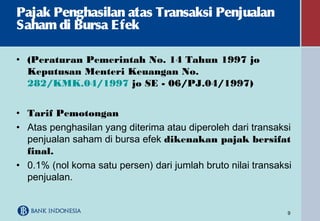 PPh Pasal 4 ayat (2) | Direktorat Jenderal Pajak Dalam hal transaksi penjualan saham atau pengalihan penyertaan modal tersebut dilakukan melalui bursa efek, maka pengenaan Pajak Penghasilannya dilakukan sesuai dengan ketentuan sebagaimana diatur dalam peraturan perundang-undangan tentang Pajak Penghasilan atas penghasilan dari transaksi penjualan saham di bursa efek.