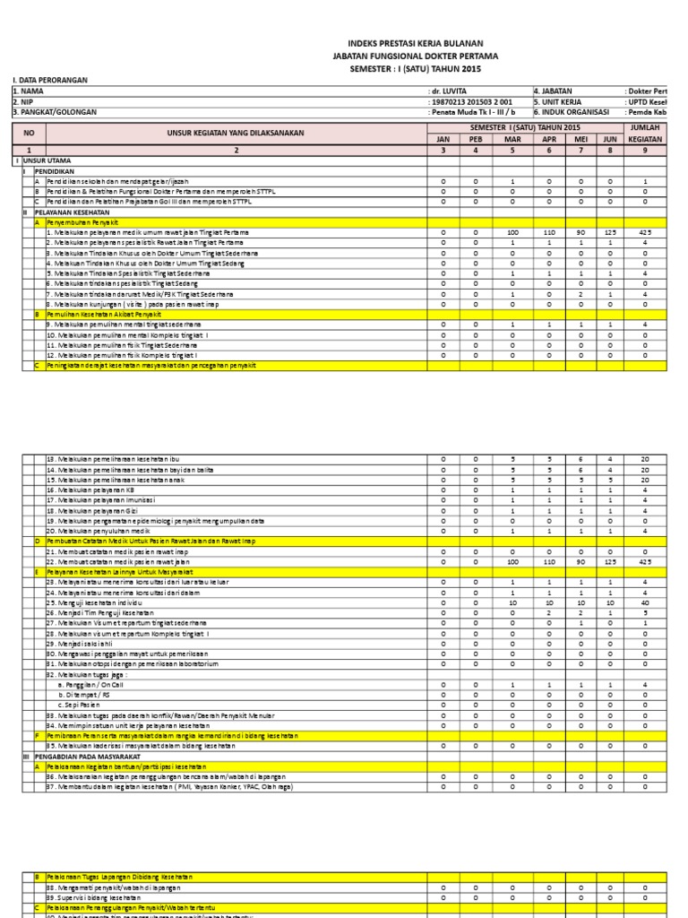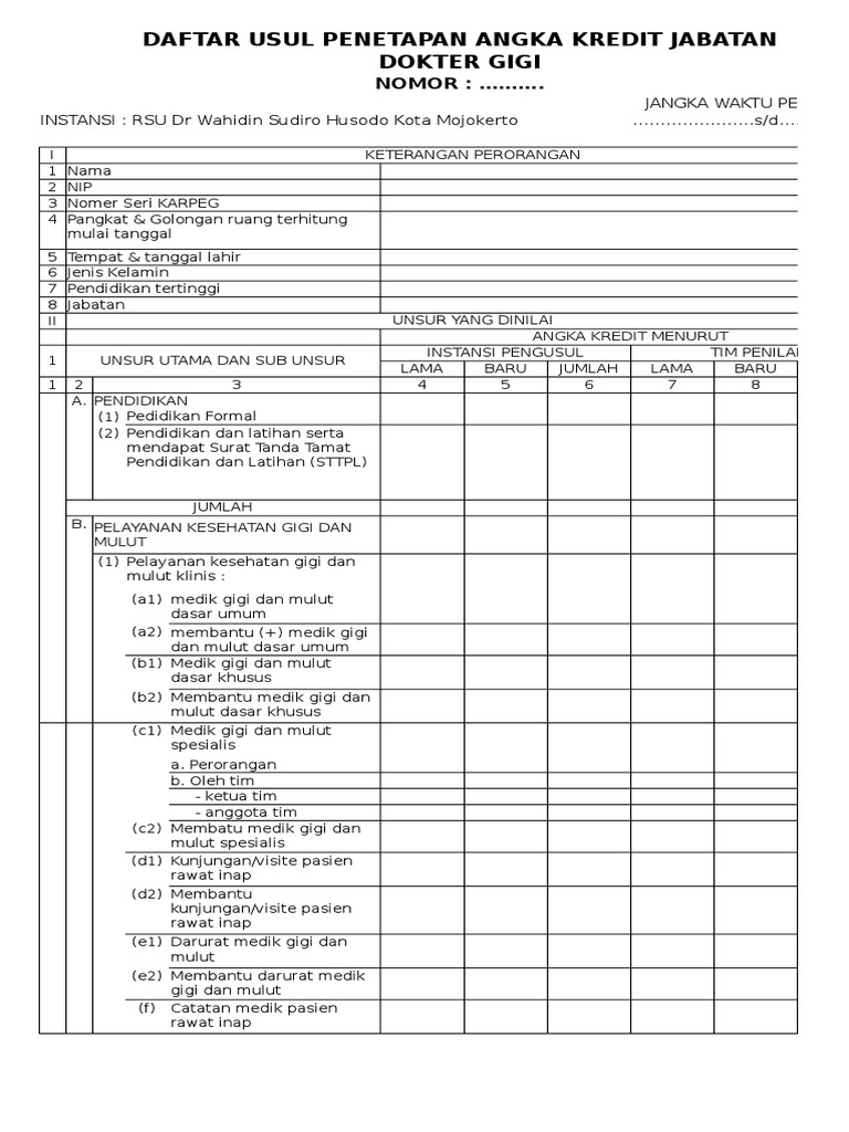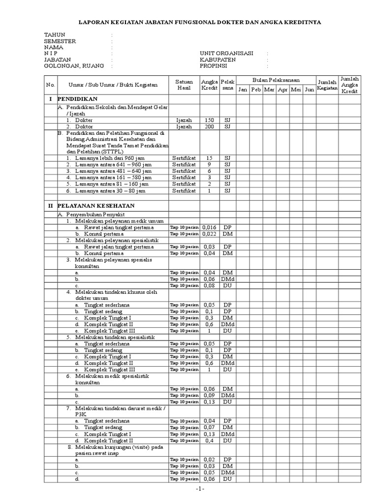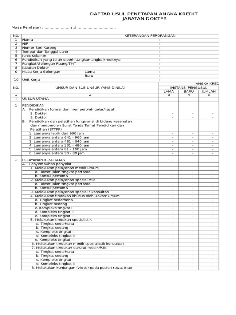 Angka kredit dokter umum. Nilai perilaku kerja PNS dinyatakan dengan angka dan sebutan sebagai berikut: a. 91 - 100 : Sangat Baik. b.76-90 : Baik. c.6I-75 : Cukup. d.51-60 : Kurang. e. 50 ke bawah : Buruk. Demikianlah yang dapat kami bagikan tentang Contoh Sasaran Kerja Pegawai (SKP) Tenaga Fungsional Umum Kesehatan, jika ada pertanyaan dapat ditanyakan pada kolom komentar. Jika berbagai peratuan tentang jabatan fungsional diatur melalui Peraturan Menpan RB atau Permenpan RB, namun untuk jabatan dokter gigi masih diatur dalam Keputusan Menpan, yakni Keuputusan Menteri Pendayagunaan Aparatur Negara dan Reformasi Birokrasi Kepmenpan RB Nomor 141/KEP/M.PAN/11/2003 tentang Jabatan Fungsional Dokter Gigi dan Angka Kreditnya. Download Formulir Dupak Dokter Umum PDF (13.00 MB) - SamPDF SamPDF Aplikasi SKP dan Dupak Dokter Umum Aplikasi SKP dan Dupak Dokter Umum...silahkan disimak cara penggunaanya...dan aplaksinya bisa didapatkan melalui url dibawah dan mohon di ingat bahwa kejujuran dalam membuat rekapan angka kredit harian dalam penggunaan aplikasi ini Created Date: 5/4/2012 4:36:10 PM