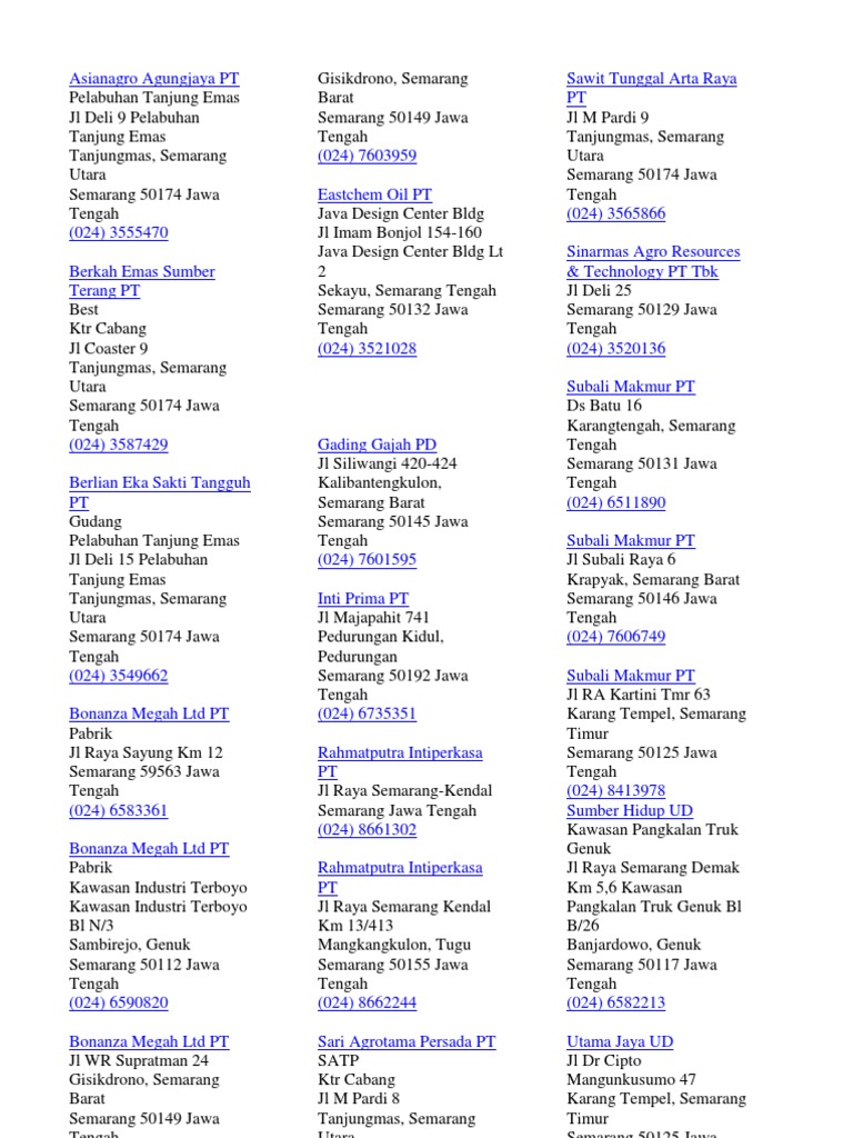 Grosir Sembako Semarang | Agen Beras, Minyak Goreng, Gula dll Telepon: (024) 3521117. PT. Berkah Emas Sumber Terang - pabrik minyak goreng Alamat: Jl. Coaster No.9 Tanjung Mas, Semarang Utara, Kota Semarang, Jawa Tengah 50129. Telepon: (024) 3587427.