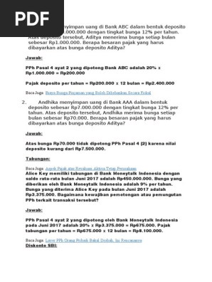 PPh Pasal 4 ayat (2) | Direktorat Jenderal Pajak Pengenaan Pajak Penghasilan atas bunga dari deposito dan tabungan serta diskonto Sertifikat Bank lndonesia adalah sebagai berikut : a. dikenakan pajak final sebesar 20% (dua puluh persen) dari jumlah bruto, terhadap Wajib Pajak dalam negeri dan bentuk usaha tetap. ... selain yang tersebut di atas, PPh disetor sendiri oleh yang menyewakan. Orang ...