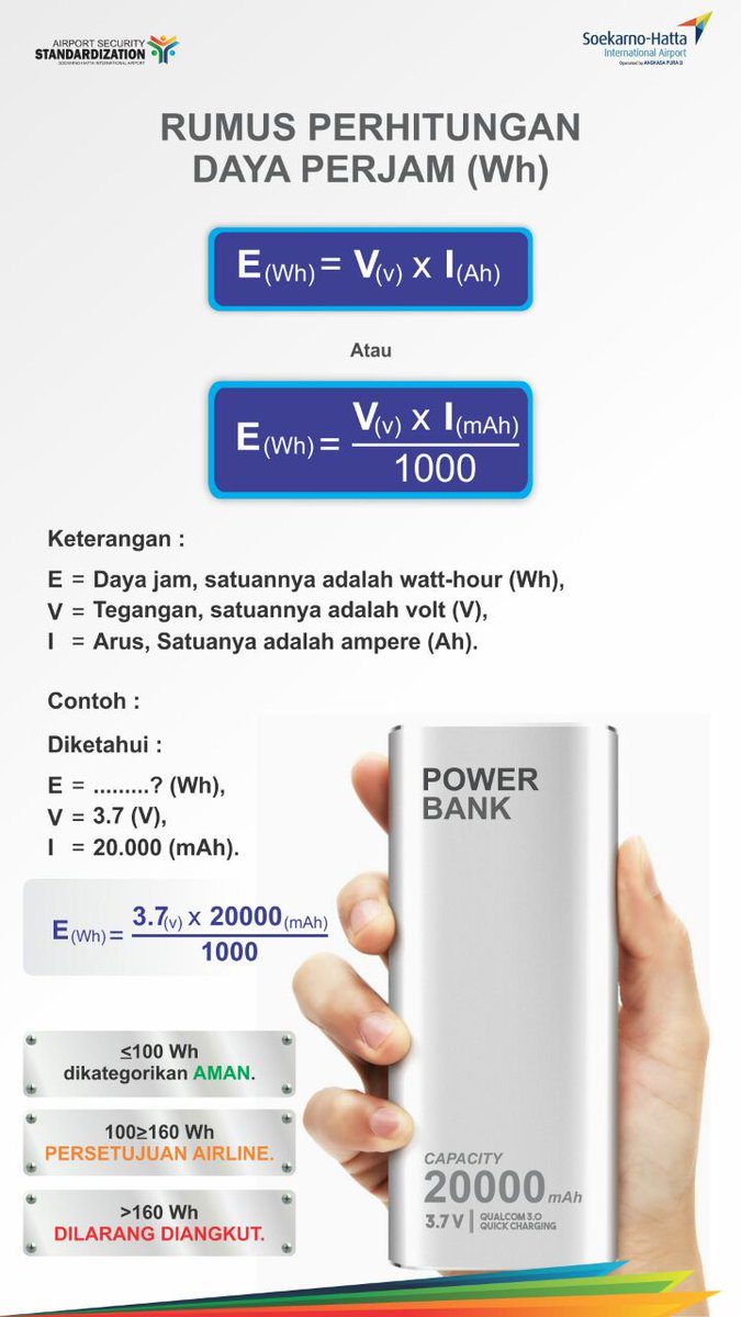 Polisi dan Bandara Soekarno-Hatta Merazia Power Bank 160 ... Sebelumnya, aturan power bank dikeluarkan Asosiasi Pengangkutan Udara Internasional (IATA). Direktorat Jenderal Perhubungan Udara Kementerian Perhubungan Agus Santoso mengatakan IATA menyatakan power bank yang berkapasitas di bawah 100 Wh dapat dibawa ke dalam bagasi kabin.. Sedangkan power bank berkapasitas 100-160 Wh harus melalui persetujuan maskapai yang bersangkutan.