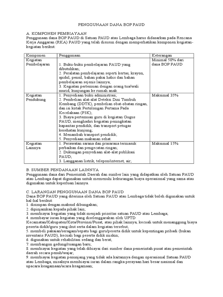 Contoh laporan penggunaan dana bop paud. May 08, 2017 · Format Laporan Penggunaan Dana BOP (Bantuan Operasional Penyelenggaraan) PAUD. Download File Format .docx Microsoft Word. Seperti kita ketahui bahwa Penggunaan dana BOP PAUD di Satuan PAUD atau Lembaga harus didasarkan pada Rencana Kerja Anggaran (RKA) PAUD yang telah disusun dengan memperhatikan komponen kegiatan-kegiatan seperti Kegiatan ... Arsip Contoh Format Laporan Penggunaan Dana BOP PAUD. Download file dalam format .docx Microsoft Word. Berkas ini mudah-mudahan berguna sebagai referensi Sep 05, 2018 · Arsip Contoh Format Laporan Penggunaan Dana BOP PAUD. Download file dalam format .docx Microsoft Word. Berkas ini mudah-mudahan berguna sebagai referensi ditujukan untuk Kepala PAUD atau Pengelola PAUD, Guru, dan pihak-pihak lain yang berkepentingan dengan pengelolaan dana BOP (Bantuan Operasional Penyelenggaraan) PAUD (Pendidikan Anak Usia Dini). Jan 09, 2017 · Format Laporan Penggunaan Dana BOP PAUD ini sesuai dengan Permendikbud Nomor 2 Tahun 2016 Tentang Petunjuk Teknis Penggunaan Dana Bantuan Operasional Penyelenggaraan Pendidikan Anak Usia Dini. Format BOP-02 RENCANA KEGIATAN DAN ANGGARAN SATUAN (RKAS) PAUD. Format BOP-03 CONTOH REKAPITULASI PENYALURAN DANA BOP PAUD KABUPATEN/KOTA.