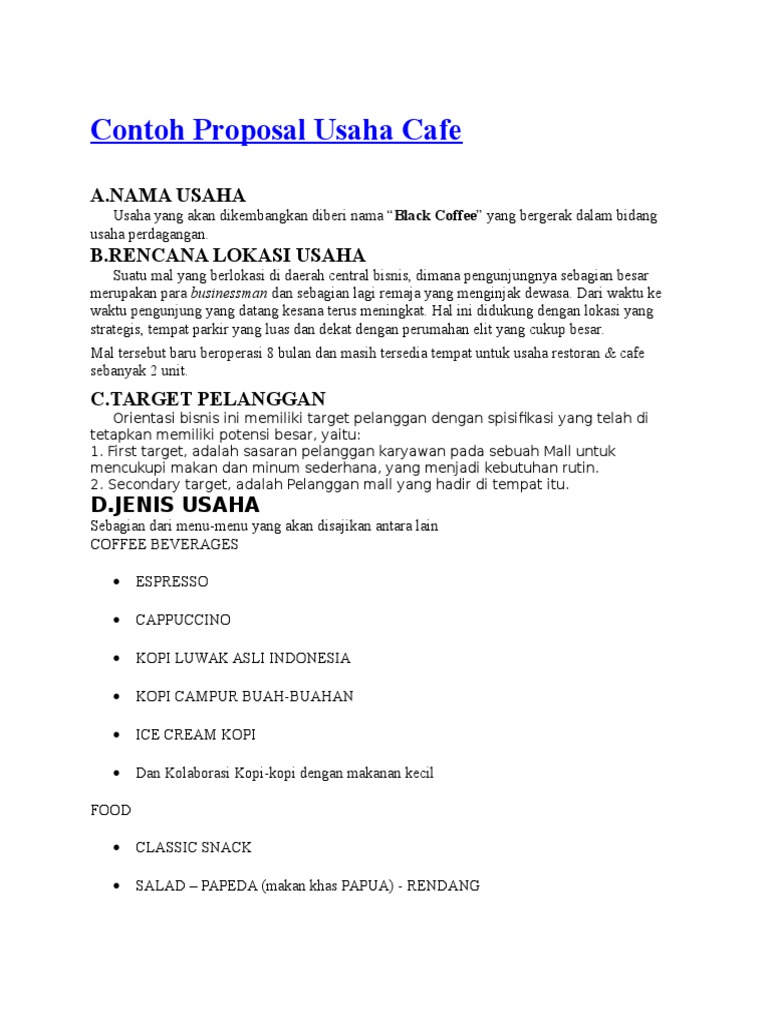 Contoh Proposal Usaha Cafe PDF Free Ebook Download. Contoh Proposal Bisnis Kedai Kopi ml.scribd. contoh proposal bisnis kedai kopi. Kata pengantar Segala puji dan syukur kita panjatkan kepada Allah SWT karena atas berkah .DOCX.PDF.TXT.