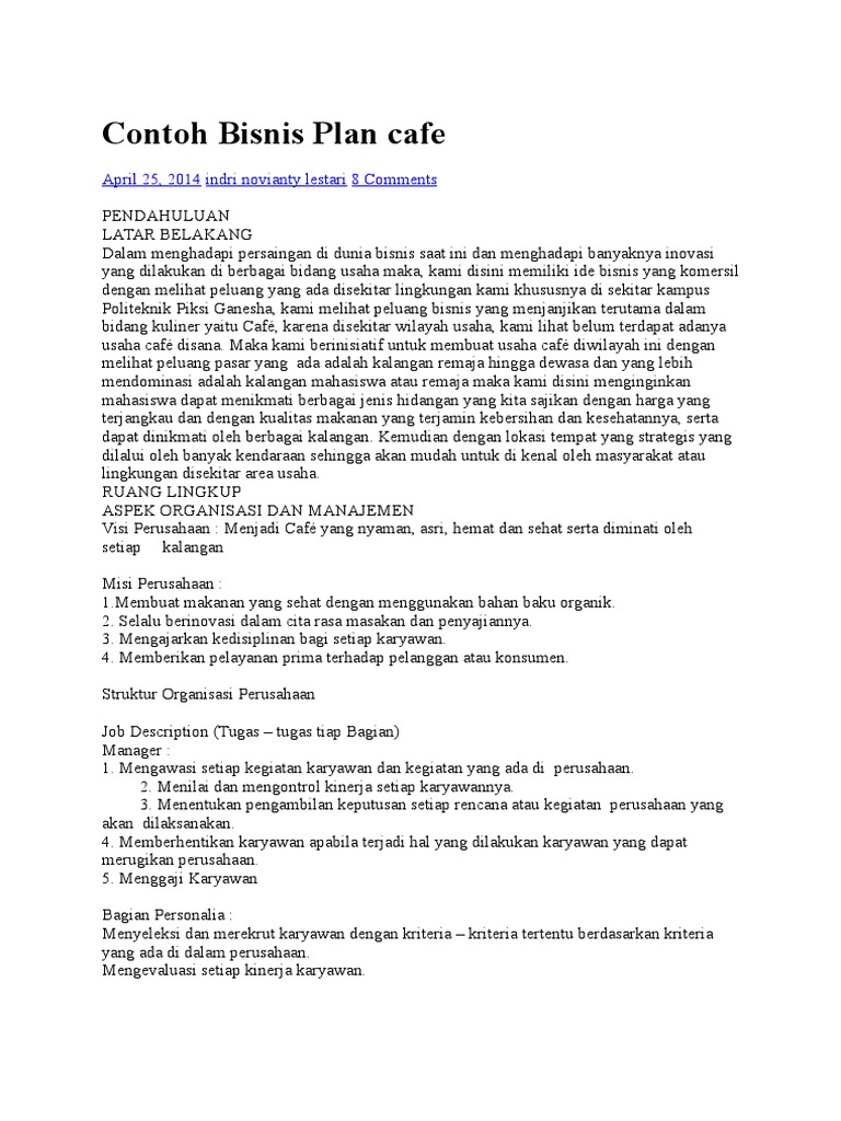 Inilah rekomendasi tentang Contoh Proposal Bisnis Plan Cafe Pdf.. Contoh bisnis plan cafe. Pendahuluan latar belakang dalam menghadapi persaingan di dunia bisnis saat ini dan menghadapi banyaknya inovasi yang dilakukan di berbagai bidang usaha maka kami disini memiliki ide bisnis yang komersil dengan melihat peluang yang ada disekitar lingkungan kami. Proposal bisnis plan cafe. AAIT Business Plan Proposal 1. Executive Summery This is a business plan proposal for the establishment of cafe having the name “Mars café” in Addis Ababa. 19 Nov 2020 — Thinking of starting a coffee shop? You'll need a solid business plan first. Salah satunya yaitu proposal bisnis plan online shop. Proposal ini berguna sebagai pertimbangan investor lain untuk membantu bisnis Anda, termasuk finansial. Investor akan memperhatikan isi dari contoh proposal usaha online shop yang Anda miliki, seperti visi misi, rincian modal, analisis SWOT... Dari mulai contoh proposal sederhana sampai ke proposal bisnis dan proyek, ini dia contoh penulisannya yang bisa kamu jadikan referensi. Contoh Proposal - Proposal merupakan sebuah rencana usulan kegiatan yang dibuat secara jelas dan sistematis dalam bentuk tulisan.