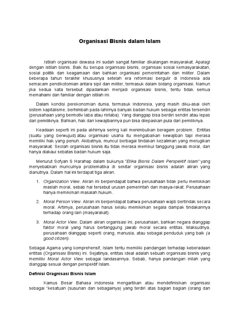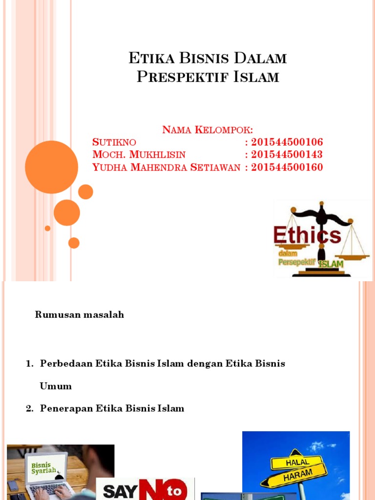 ETIKA BISNIS DALAM PERSPEKTIF ISLAM - Academia.edu Dalam Islam, etika (akhlak) sebagai manusia sebagai pelaku bisnis, mempunyai cerminan kepercayaan Islam (iman). Etika Islam tanggung jawab moral kepada Tuhan atas perilaku memberi sangsi internal yang kuat serta otoritas bisnis.