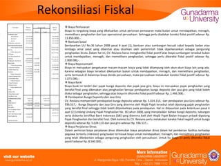 2. Akibat koreksi fiskal dari Laporan Keuangan komersial menjadi Laporan Keuangan fiskal menyebabkan perbedaan antara laba komersial Pendapatan dari luar usaha : a. Pendapatan sewa tanah ( setelah PPh ) 12. b. Pendapatan bunga bank / jasa giro ( setelah PPh ) 7. c. Penghasilan... 6 Contoh pencatatan pendapatan bunga : Pada tanggal 1 Januari 2009 mendapatkan bunga Karena penghasilan ini terkena PPh final, maka harus dikoreksi negatif dalam rekonsiliasi fiskal pada akhir 8 Untuk keperluan penyusunan neraca komersial dan neraca fiskal, kas dan bank dilaporkan... Pendapatan bunga deposito sebesar 50.000 tidak boleh digabungkan karena merupakan pajak final. Harus dikoreksi negatif (-). Sedangkan beban bunga sebesar 40.000 bisa diakui sebagai biaya, dan sejumlah 6.000 (40.000 x 15%) akan dijadikan kredit pajak pph 23. j. Pendapatan sewa dikenakan... Pendapatan bunga pada Maret 2021 sebesar Rp201,76 triliun, meningkat dari periode yang sama tahun sebelumnya sebesar Rp201,25 miliar. Kenaikan tersebut disumbang dari komponen surat berharga yang tumbuh 25,26% yoy dan komponen lainnya yang tumbuh 4,62% yoy.