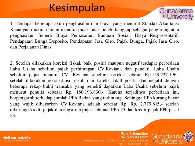 REKONSILIASI FISKAL (18). Koreksi Fiskal atas Biaya Bunga Pinjaman. Lebih lanjut, sesuai ketentuan yang di atur dalam Pasal 4 ayat (2) UU PPh, penghasilan berupa bunga deposito, tabungan, serta diskonto Sertifikat Bank Indonesia (SBI) yang diterima baik oleh wajib pajak badan maupun...