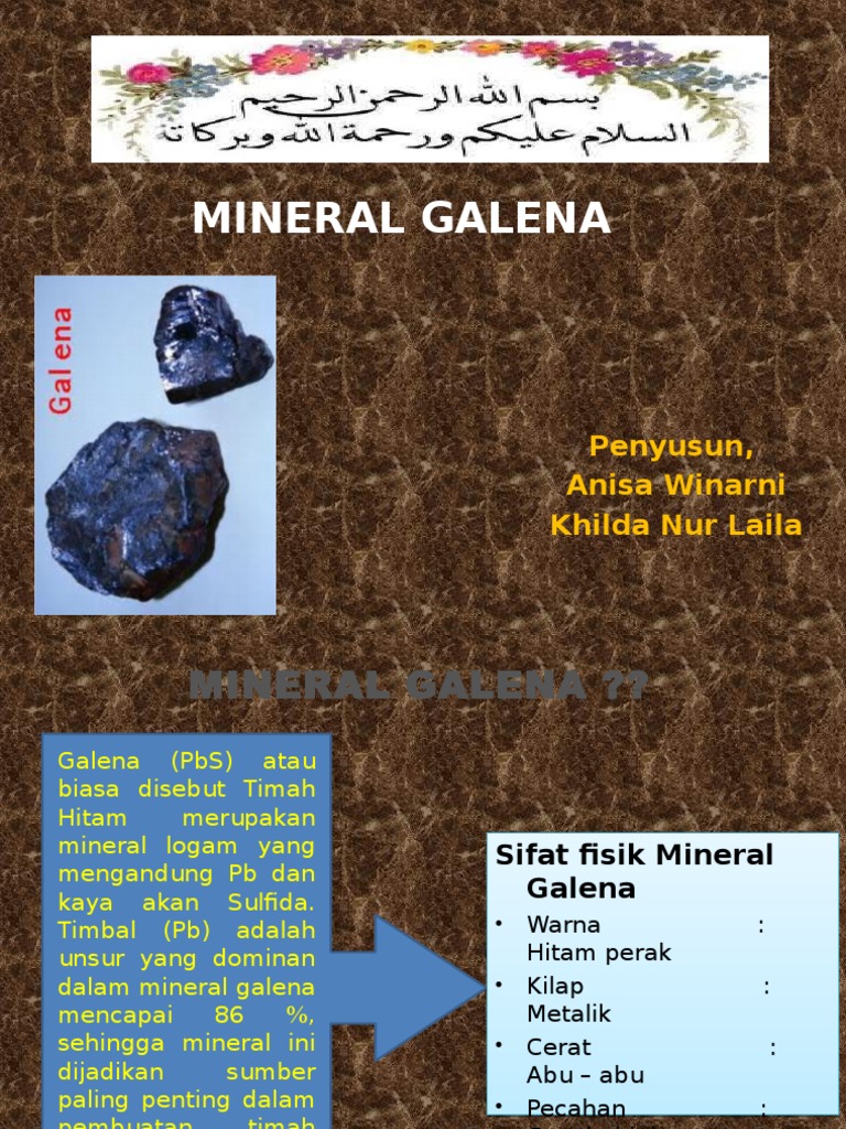 Galena Galena (PbS) atau biasa disebut Timah Hitam merupakan mineral logam yang mengandung Pb dan kaya akan Sulfida, berasosiasi dengan mineral - mineral sulfida lainnya seperti Sphalerite, Chalcophyrite, Phyrite, Arsenophyrite dan biasa juga ditemukan bersama2 dengan Emas (Au)...