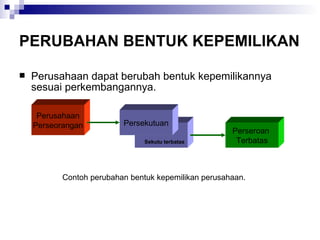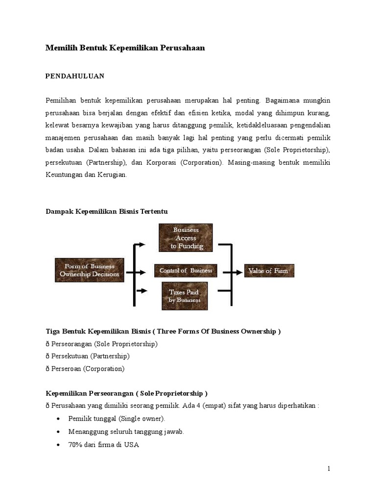 BENTUK KEPEMILIKAN BISNIS - PDF Download Gratis Transkripsi. 1 BENTUK KEPEMILIKAN BISNIS Kemungkinan bentuk kepemilikan Bisnis adalah Perusahaan Perorangan, Perusaha- an Kemitraan (Firma atau CV) dan Korporasi. Dengan bentuk yang jelas menurut hukum dapat diharapkan bahwa perusahaan akan dapat dengan tegas...