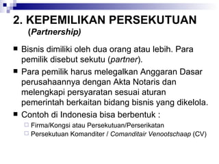 MEMILIH BENTUK KEPEMILIKAN BISNIS by :teur afriany - ppt... 2 Tiga bentuk dasar bentuk kepemilikan bisnis 1.kepemilikan perseorangan 2.kepemilikan persekutuan 3.kepemilikan perseroan terbatas. 3 1. Kepemilikan Perseorangan (Sole Proprietorship) Bisnis yang dimiliki oleh seorang pemilik. Contoh nya : restoran lokal, perusahaan...