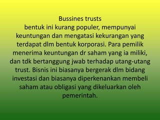 Bentuk-bentuk Kepemilikan Bisnis | Shandrakatherine's Blog Bentuk-bentuk kepemilikan bisnis. Terdapat beberapa bentuk perusahaan atau badan usaha, yaitu Bentuk ini merupakan suatu kerjasama antara beberapa perusahaan yang berasal dari beberapa negara, menjadi satu perusahaan untuk mencapai konsentrasi kekuatan ekonomi yang...