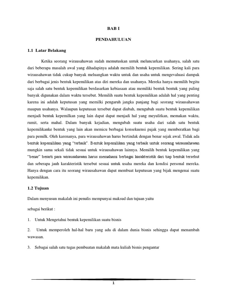 bentuk kepemilikan bisnis BAB I. PENDAHULUAN. A. Latar Belakang. Bisnis merupakan profesi atau perusahaan komersial yang beroperasi dengan tujuan mendapatkan keuntungan melalui penyediaan barang atau jasa. Tujuan utama dari bisnis adalah keuntungan, mempertahankan kelangsungan hidup perusahaan...