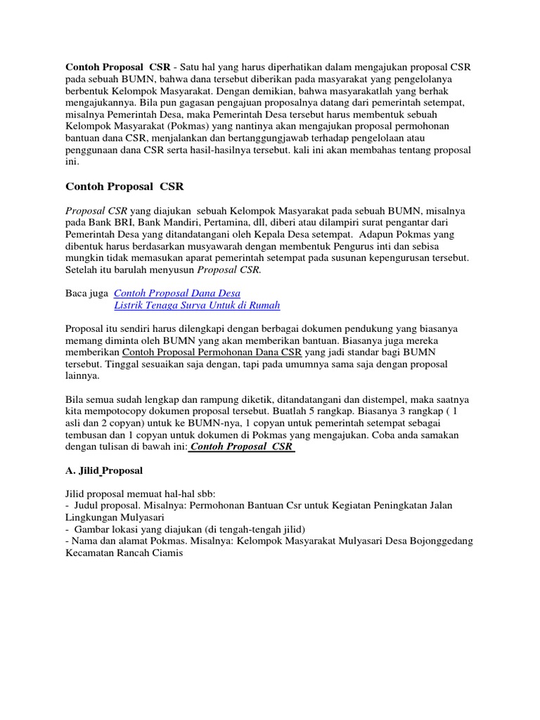 PDF PROPOSAL KERJASAMA CSR dan SWASTA - ADOC.PUB Contoh ... Demikianlah pembahasan mengenai cara mendapatkan dana CSR dari perusahaan. Jika anda memiliki informasi untuk lebih melengkapi pembahasan video ini, silahkan tulis di kolom komentar. Siapa tau hal tersebut bermanfaat untuk penonton lainnya. #TipsBisnis #PeluangUsaha #BelajarBerbisnis #MotivasiBisnis Cara Mendapatkan Dana CSR Dari Perusahaan Dengan Mudah! Sep 03, 2018 · Tata Cara atau Persyaratan Untuk Mendapatkan Dana CSR 1. Mengajukan proposal permohonan pinjaman seperti: Data pribadi sesuai dengan KTP. Laporan Keuangan meliputi Laporan Keuangan/ Catatan Keuangan 3 (tiga) bulan terakhir (Cash Flow, Neraca, Laba-Rugi dan Perubahan modal.