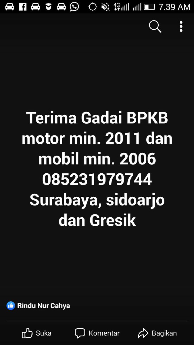 Tempat Gadai BPKB Motor & Mobil Di SURABAYA - Gadai BPKB Tempat Gadai BPKB Motor & Mobil Di SURABAYA. setelah anda menghubungi kami akan langsung memproses data yang anda kirim dan bisa Langsung Cair, Syarat yang mudah dan cepat, cicilan murah, Bunga yang ringan, Pencairan pinjaman dana anda bisa Maksimal