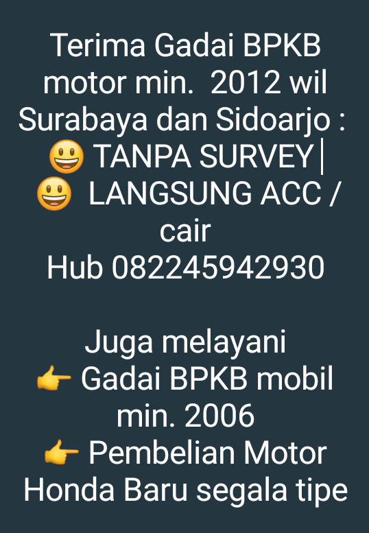 Gadai BPKB mobil di Surabaya | Leasing pembiayaan kredit ... Gadai BPKB mobil di Surabaya - Gadai BPKB mobil dan Gadai BPKB motor Surabaya , BFI Finanace cabang Surabaya merupakan solusi paling utama pada saat ini sangat sekali dibutuhkan dalam masalah dana atau uang tunai yang sifatnya sangat mendesak sekali dan bukan hanya itu BFI Finance bisa memproses bagi yang sedang memerlukan dana tunai cepat dalam proses pinjaman dana tunai gadai bpkb mobil ... Gadai BPKB Mobil Surabaya Proses Cepat - BFI Finance Gadai bpkb mobil Surabaya cepat, cuma 1 hari pinjaman dana jaminan bpkb mobil mampu langsung dilunasi dengan bunga rendah di BFI Finance Surabaya dan segala wilayah Indonesia.. BFI Finance adalah perusahaan pembiayaan multifungsi yang menyediakan layanan kredit bpkb mobil dan pembiayaan kredit mobil bekas. Gadai BPKB Mobil & Motor di surabaya gadai bpkb mobil & motor surabaya. anda butuh pembiayaan???. pinjaman uangtunai cepat dengan jaminan bpkb mobil dan motor.. pembiayaan untuk membeli mobil atau motor pribadi dari teman, tetangga, saudara. secara kredit. kami siap membantu anda. hp/wa : maro. 0813 8794 6338. Gadai Bpkb Sepeda Motor Surabaya Bfi Finance Tanpa Bi Cek GADAI BPKB SEPEDA MOTOR SURABAYA: BFI FINANCE RESMI Ibu Zefa HP/WA 0822-3301-6554 Proses Cepat Cair Tanpa Survei Plafon Tinggi 1 MAR 2022