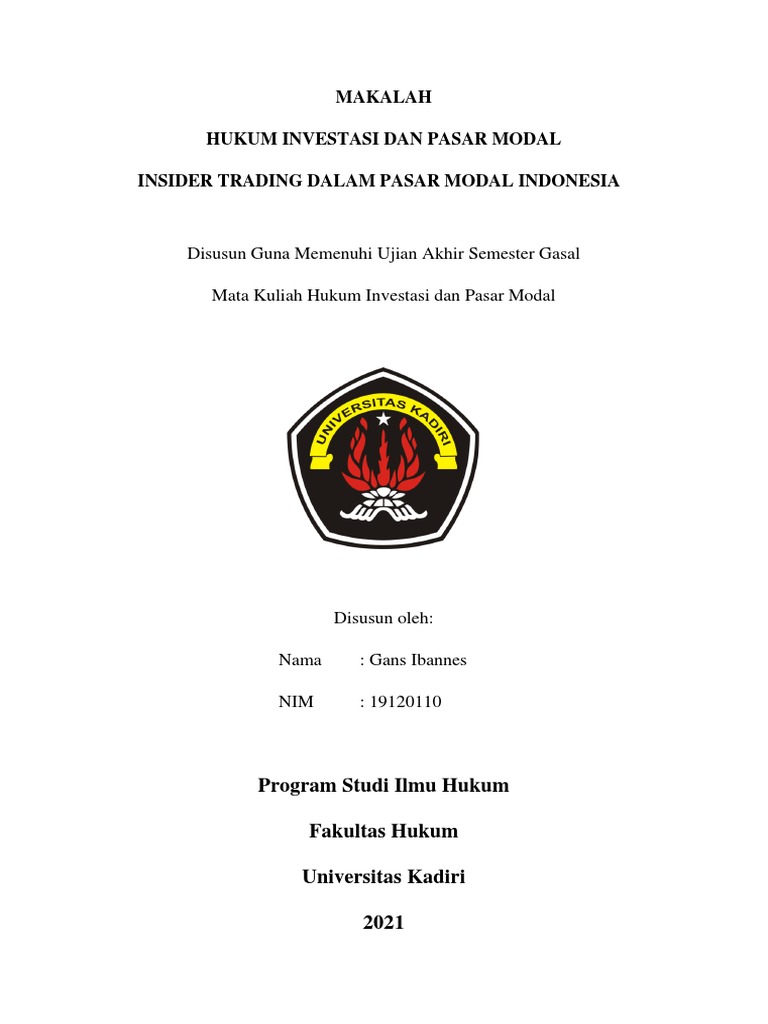 (DOC) makalah hukum investasi dan pasar modal | ferdian ... makalah hukum investasi dan pasar modal. INSIDER TRADING DALAM PASAR MODAL INDONESIA Makalah Mata Kuliah Hukum Investasi & Pasar Modal Di susun oleh: FerdianArief NIM: 201533050132 JURUSAN ILMU HUKUM FAKULTAS HUKUM UNIVERSITAS JAYABAYA 2016 f KATA PENGANTAR Puji dan syukur penulis panjatkan kepada Tuhan Yang Maha Esa atas selesainya makalah ...