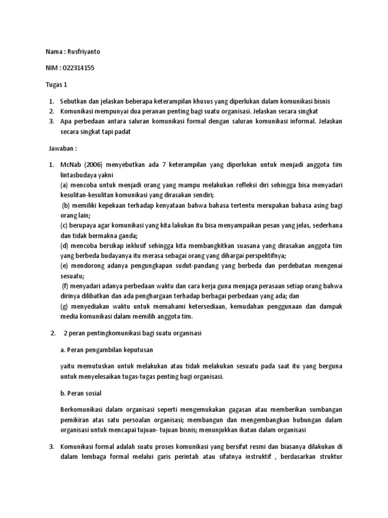 Kartu Soal Bentuk Uraian Komunikasi Bisnis | PDF Menjelaskan hubungan antara komunikasi dengan bisnis. Penskora n MENJELASKAN 3- Komunikasi Verbal adalah bentuk komunikasi HUBUNGAN ANTARA yang disampaikan komunikator kepada komunikan 20 KOMUNIKASI VERBAL dengan cara tertulis / lisan... Jelaskan hubungan antara hak dan kewajiban asasi manusia dengan... Hal ini sesuai dengan prinsip hak asasi manusia bahwa hendaknya sesama manusia bergaul satu sama lainnya dalam semangat persaudaraan. d. Kerakyatan yang dipimpin oleh hikmat kebijaksanaan dalam permusyawaratan perwakilan dicerminkan dalam kehidupan pemerintahan, bernegara, dan... Komunikasi Bisnis yang Efektif - Ruang Lingkup dan Tujuan Komunikasi Bisnis merupakan komunikasi yang digunakan untuk membangun hubungan antar perusahaan dalam dunia bisnis. Hal ini dilakukan guna saling mempromosikan atau mempresentasikan suatu nilai produk atau jasa yang dimiliki oleh perusahaan kepada pihak buyer maupun perusahaan...