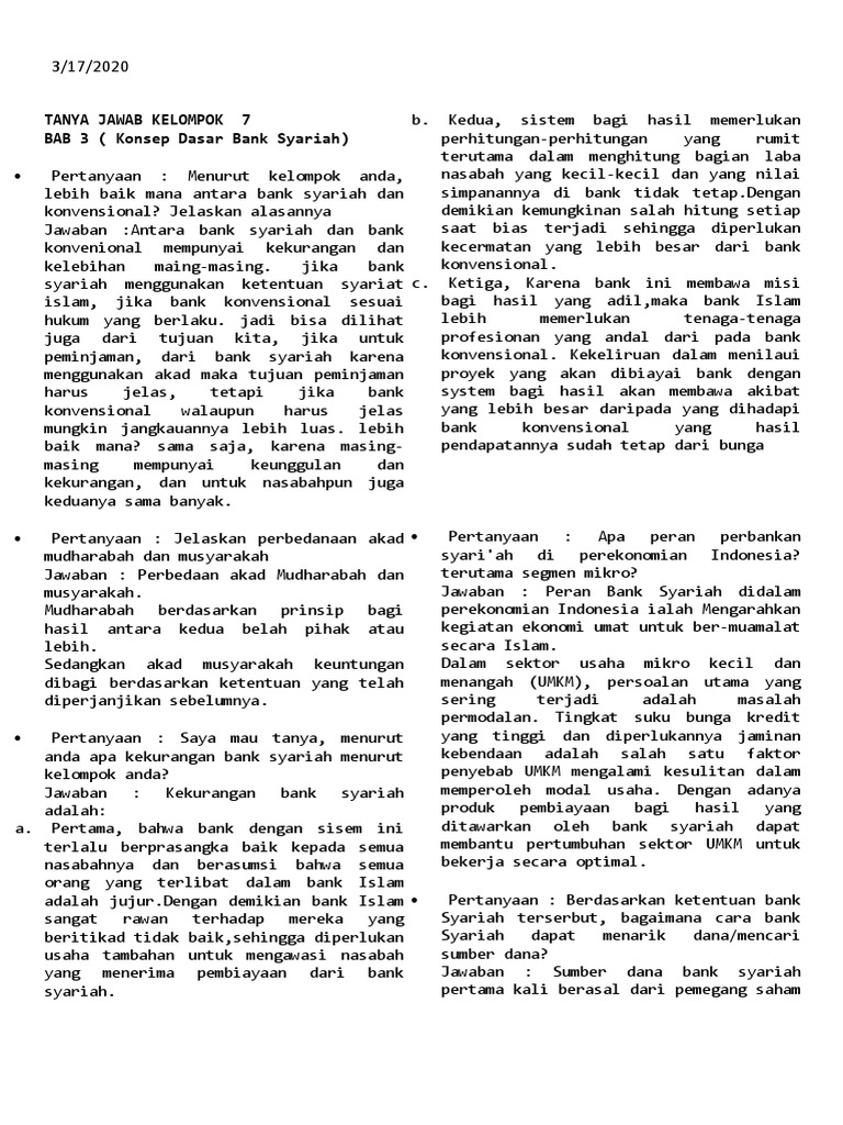 Makalah Agama : Perbedaan Bank Syariah Dan Bank Konvensional Bank konvensional dapat didefinisikan seperti pada pengertian bank umum pada pasal 1 ayat 3 Undang-Undang No. 10 tahun 1998 deng an menghilangkan kalimat "…dan atau berdasarkan prinsip syariah …", sehingga definisi bank konvensional menjadi "bank yang melaksanakan kegiatan usaha secara konvensional yang dalam kegiatannya memberikan ... Pertanyaan Tentang Obligasi Syariah - Alvindayu.com 10/02/2022 Pertanyaan tentang bank syariah dan kunci jawaban - Pada kali ini, muttaqin blog akan membagikan latihan soal yang membahas tentang materi perbankan, baik itu perbankan konvensional maupun perbankan syariah.Akan tetapi, dalam soal ini, memang sebagian besar menggunakan materi perbankan syariah sebagai bahan dalam penyusunan soal.
