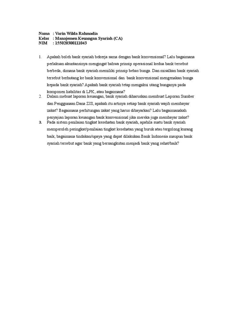 :: LAMPUNG POST :: Senin, 12 Agustus 2013 by ... - Issuu Belum efektif Memang secara normatif, penggunaan dan pemanfaatan mobil dinas telah diatur secara tegas dalam Permen PAN dan RB Nomor 87 Tahun 2005 tentang Pedoman Peningkatan Pelaksanaan ... Pertanyaan Tentang Manajemen Risiko Bank Syariah - Gelsene Pertanyaan tentang bank syariah dan kunci jawaban Pada kali ini muttaqin blog akan membagikan latihan soal yang membahas tentang materi perbankan baik itu perbankan konvensional maupun perbankan syariahAkan tetapi dalam soal ini memang sebagian besar menggunakan materi perbankan syariah sebagai bahan dalam penyusunan soal. 5 Perbedaan Keuntungan Menjadi Nasabah Konvensional dan ... Dalam sektor perekonomian, nasabah konvensional maupun syariah mendapatkan keuntungan dari jasa bank yang dipilih. Jika tidak ada bank perputaran uang yang terjadi di masyarakat tidak akan semulus sekarang. Bank memiliki berbagai fungsi transaksi seperti memberikan pinjaman, penyimpanan uang, penarikan uang, dan banyak jenis transaksi lainnya. TANYA JAWAB PERBANKAN SYARIAH - Academia.edu Jawab: Prosedur pendirian Bank Umum Syariah tertuang dalam Pasa13 dan Pasal 4 PBI No. 6/24/PBI/2004 tentang Bank Umum Yang Melaksanakan Kegiatan Usaha ' Berdasarkan Prinsip Syariah, yang intinya menyatakan bahwa: Pasal3: Bank hanya dapat didirikan dengan izin Bank Indonesia melalui dua tahap, yakni persetujuan prinsip sebagai persetujuan untuk ...
