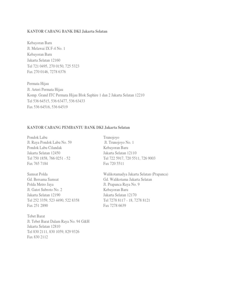South Jakarta - Bank DKI BANK DKI. Kebayoran Baru. Komplek Wijaya Graha Puri Blok B1-3, Jl Wijaya II Kebayoran Baru, Jakarta Selatan - 12160. Pondok Indah. Jl. Metro Duta II Blok UA No. 7-8, Jakarta Selatan, 12310. Rasuna Said. Graha Aktiva lt. Dasar Jl.HR Rasuna Said Kav 3 , Blok X-1, Kuningan Timur, Setiabudi, Jakarta Selatan 12950. Walikota Jakarta Selatan. Bank DKI Dorong Pertumbuhan Kredit Konsumer Tahun 2022 ... Babay menyampaikan bahwa Bank DKI juga akan melakukan inisiasi kerjasama pemasaran dengan pihak ke-3 yang menjual barang/jasa yang bersifat konsumtif, termasuk diantaranya pembelian kendaraan roda empat. Terbaru Bank DKI telah melakukan kerjasama dengan Istana Kebayoran Raya Motor yang merupakan salah satu dealer Honda Mobil. Alamat Lengkap dan Nomor Telepon Kantor Bank DKI di ... Alamat Lengkap dan Nomor Telepon Kantor Bank DKI di Jakarta Selatan. Portal Alamat, - Bank DKI pertama kali didirikan tanggal 11 April 1961 di Jakarta dengan nama "PT Bank Pembangunan Daerah Djakarta Raya", kemudian di tahun 2008 perubahan bentuk dan badan hukum menjadi PT. Bank DKI . Bank DKI Memiliki visi Menjadi Bank Regional Modern ...
