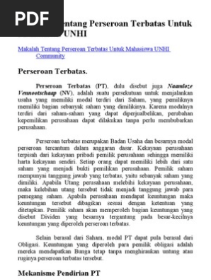 42 perusahaan yg modalnya dari penjualan saham yaitu ... Perseroan terbatas ( Naamloze Venootschap) atau biasa disebut dengan PT, adalah badan usaha yang modalnya terdiri dari saham-saham, yang pemiliknya memiliki bagian sebanyak saham yang dimiilkinya. Karena modalnya berupa saham-saham yang dapat diperjualbelikan, maka kepemilikan dapat berganti-ganti tanpa adanya pembubaran perusahaan. Perusahaan ...