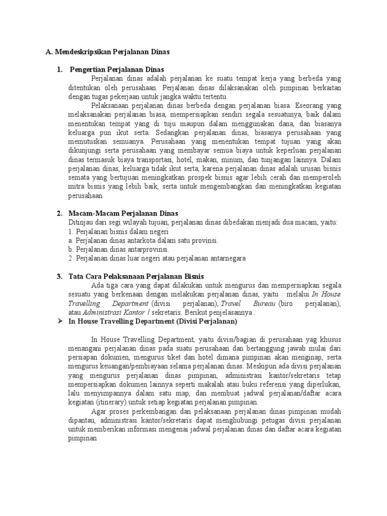 Modul Perjalanan Dinas - PDF Free Download Mendeskripsikan tata cara pelaksanaan perjalanan dinas. Menerapkan macam-macam perjalanan dinas. B. MACAM-MACAM PERSIAPAN PERJALANAN BISNIS a. Persiapan Transportasi. Persiapan transportasi yang dipilih meliputi darat, laut dan udara.