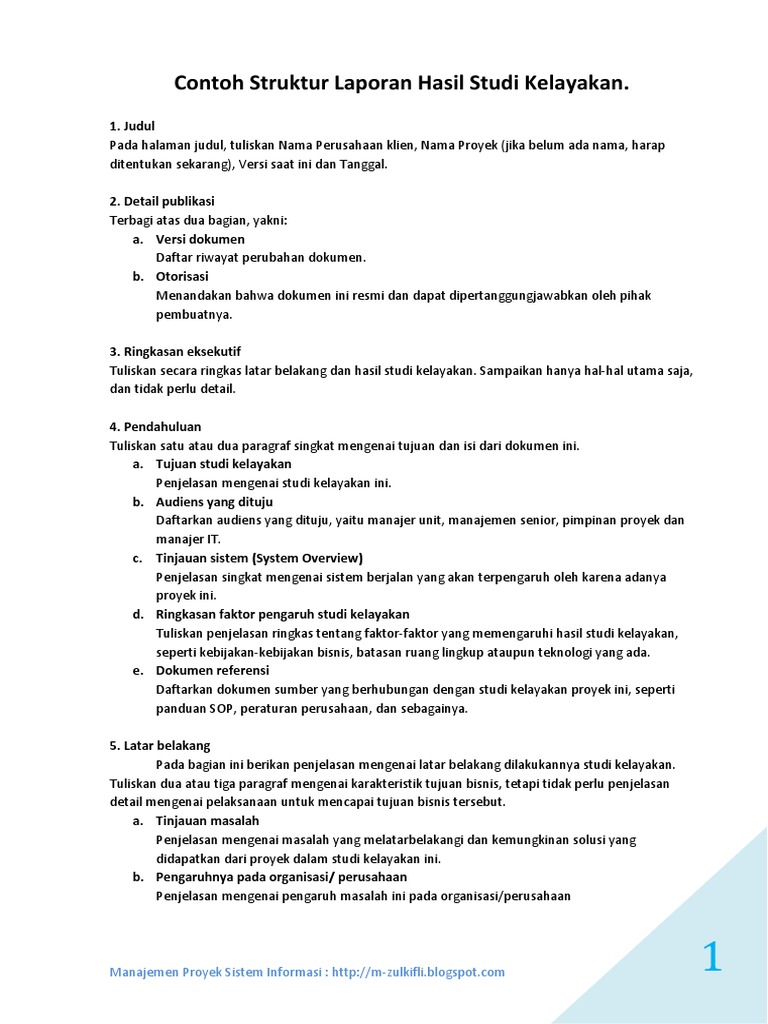Studi kelayakan - Wikipedia bahasa Indonesia, ensiklopedia ... Studi kelayakan yang dirancang dengan baik seharusnya menyertakan latar belakang sejarah dari proyek, deskripsi mengenai produk atau jasa, laporan keuangan, rincian operasi dan manajemen, kebijakan dan riset pemasaran, data keuangan, persyaratan hukum, dan kewajiban pajak.