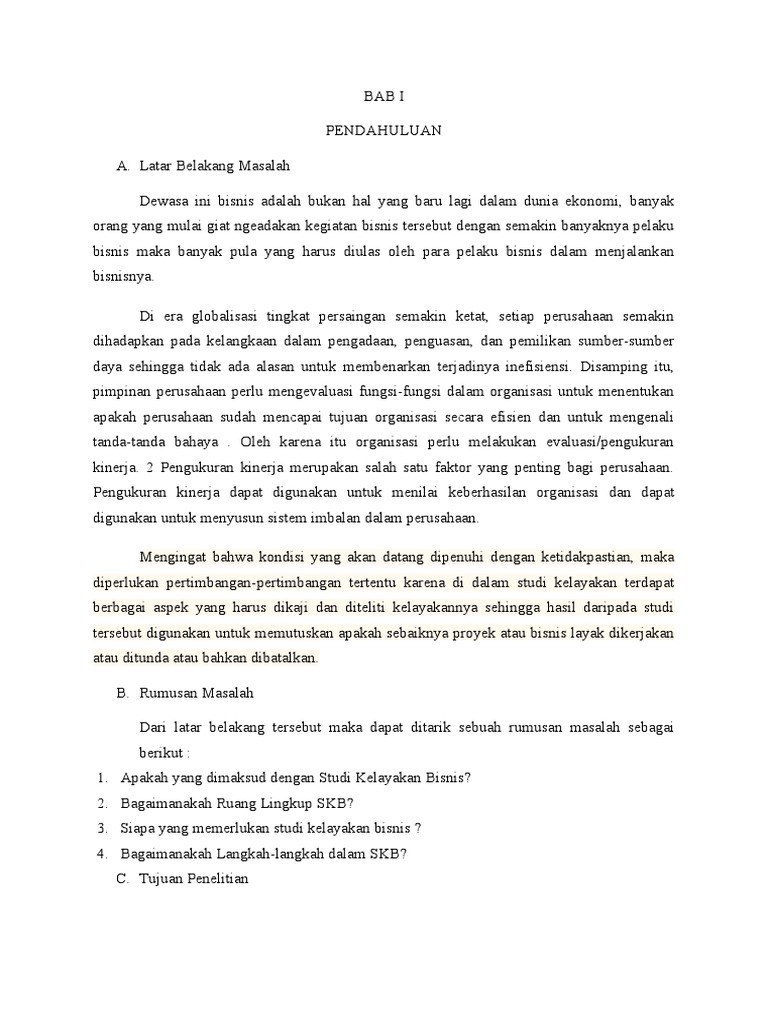 MAKALAH STUDI KELAYAKAN BISNIS - Academia.edu MAKALAH STUDI KELAYAKAN BISNIS ASPEK-ASPEK DALAM MANAJEMEN, POAC, BALANCE SCROECARD, DAN SIX SIGMA Laporan dibuat guna memenuhi syarat tugas mata kuliah Studi Kelayakan Bisnis serta nilai guna yang dapat dipelajari dari materi yang dibahas Dosen Pengampu : Mar'atul Fahima, S.P., M.M. Disusun oleh : Vindi Nur Maharani (1405140013) Nurlaili Munasifah (14051400__) Agus Syarifudin (14051400 ... PDF BAB I PENDAHULUAN 1.1. Latar Belakang Latar Belakang Studi kelayakan bisnis atau bisa dikatakan sebagai salah satu kegiatan yang mempelajari tentang sebuah kegiatan yang akan dijalankanya secara mendalam, untuk menentukan kelayakannya dari suatu bisnis tersebut menurut Yanuar, (2016:42). Makalah Analisis Bisnis dan Kelayakan Usaha Jadi, studi kelayakan usaha dapat memberikan pedoman atau arahan pada usaha yang akan dijalankan. Dapat disimpulkan bahwa pengertian studi kelayakan usaha adalah: Sutau kegiatan yang mempelajari secara mendalam tentang suatu kegiatan, usaha atau bisnis yang akan dijalankan, dalam rangka menentukan layak atau tidak usaha tersebut dijalankan. APASAJA.COM: Contoh : Makalah Studi Kelayakan Bisnis Latar Belakang. Buah markisa merupakan salah satu jenis buah dengan tingkat produksi yang cukup tinggi setiap tahunnya di Indonesia yaitu sekitar 120.128 ton/tahun. Bentuk serbuk yang lebih praktis diharapkan dapat menambah umur simpan, dapat menambah minat untuk mengkonsmsi markisa yang sangat kaya akan kandungan zat gizi tersebut untuk ...