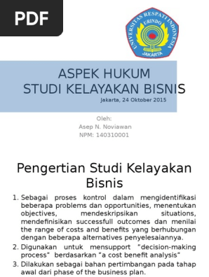 ASPEK HUKUM DALAM STUDI KELAYAKAN BISNIS - Academia.edu Aspek hukum merupakan aspek yang pertama kali harus dikaji dalam studi kelayakan bisnis. Hal ini karena jika berdasarkan analisis pada aspek hukum sebuah ide bisnis sudah tidak layak maka proses tersebut tidak perlu diteruskan dengan analisis pada aspek-aspek yang lain.